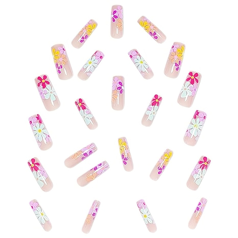 24 PCS long flat flowers Nail Art, Long Length Long Water Pipe Fake Nails,Square Head Nail Tips False Nail
