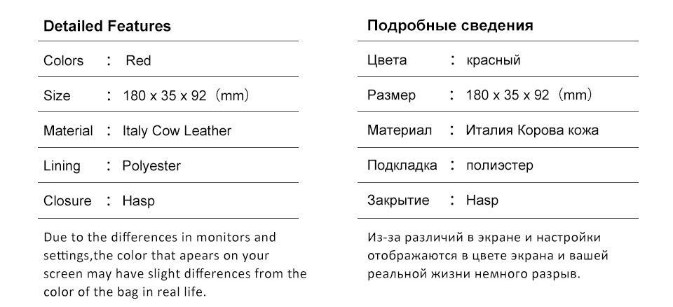 Size: 180x 35x92 (mm)Material : Italy Cow LeatherLining : PolyesterClosure : Hasp